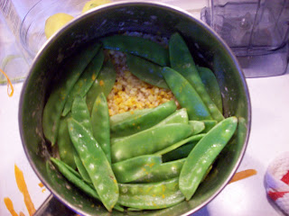 around 11:45 we headed to the kitchen to finish up lunch prep. by this point the rice was turned way low and all of the water was absorbed, so i threw the fresh snow peas on top and put the lid back on. i do this all the time! it is a quick way to steam some veggies without having to mess up another pan! i love this method. i do it with noodles and broccoli too.